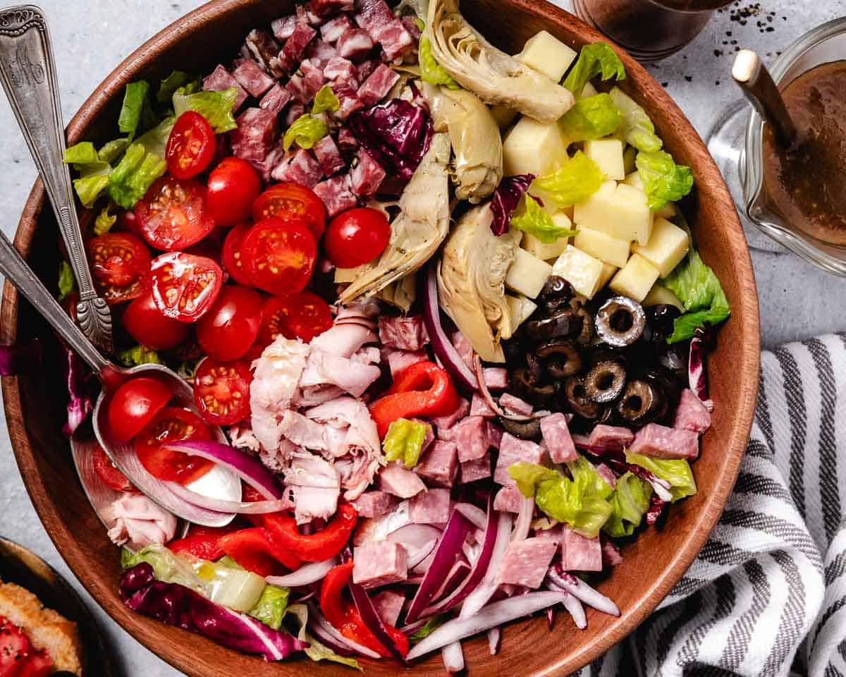 Italian Antipasto Salad is a chopped salad loaded with classic deli meats, cheese, and crisp vegetables. Dressed with a tangy balsamic vinaigrette, this salad is bold enough to serve as dinner yet simple enough to enjoy as a side.