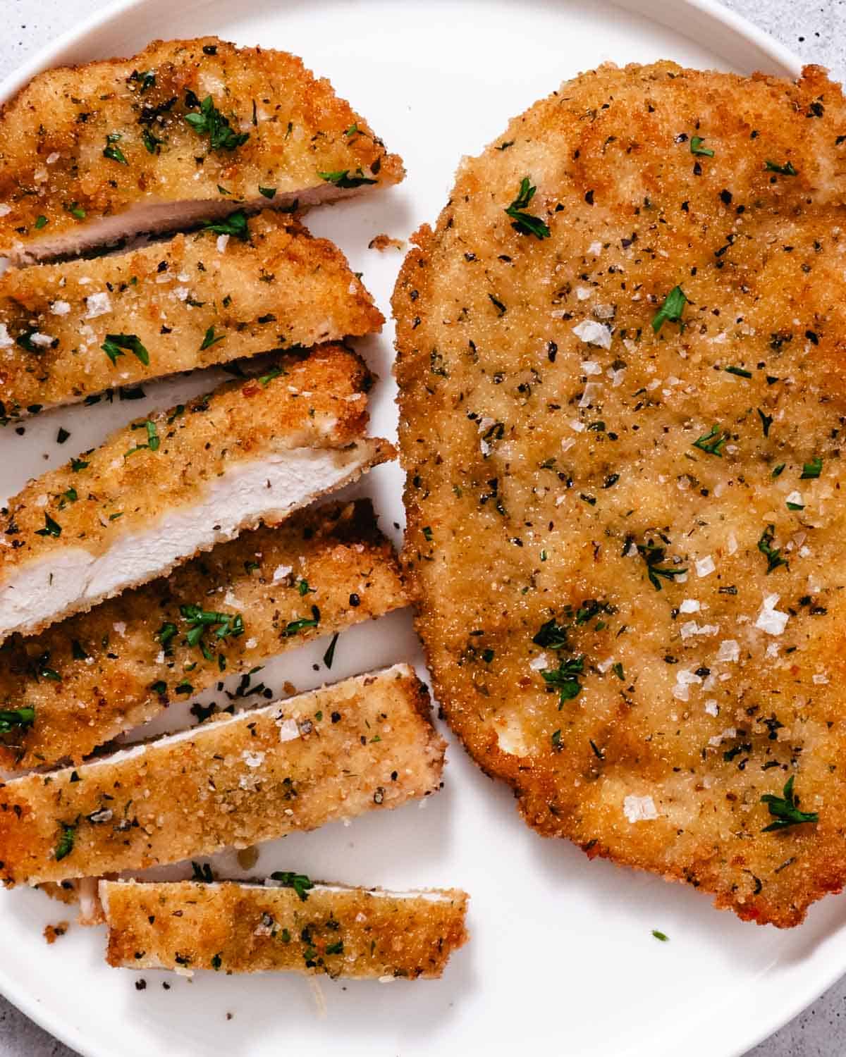 Pan Fried chicken cutlets made with Italian bread crumbs are cooked in oil until golden brown and crispy. Thin chicken breasts cook fast and come out crisp on the outside and juicy inside. This is a classic family dinner that everyone always loves.