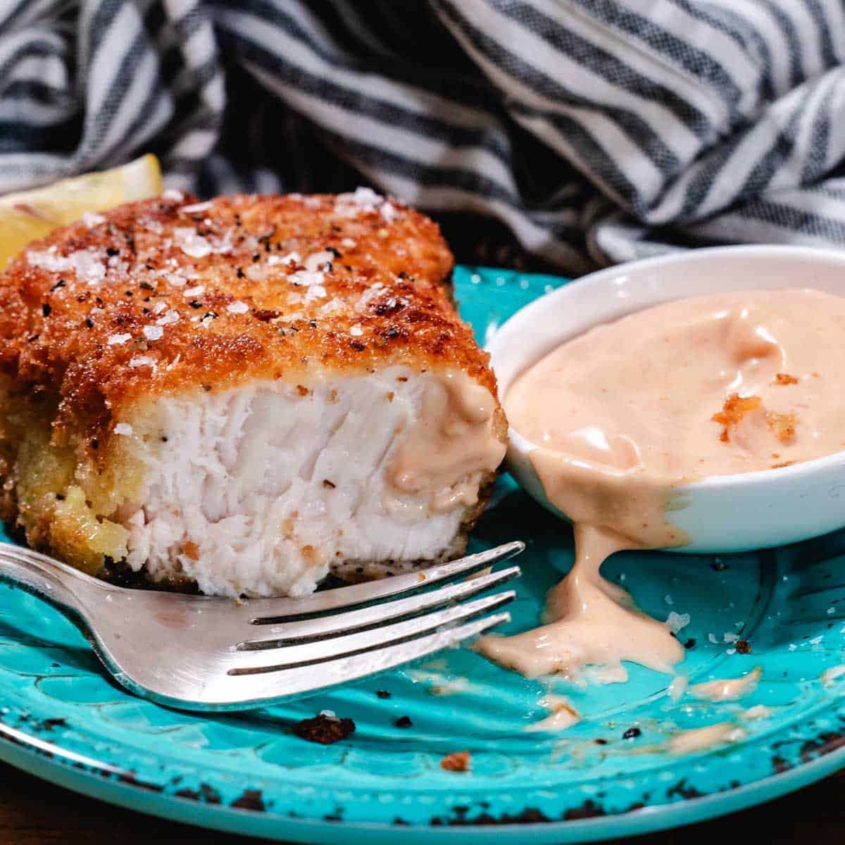 I added a little Old Bay to the seasoning and this dinner hit it out of the park. I served it with tartar sauce, roasted broccoli, and a lemon wedge.