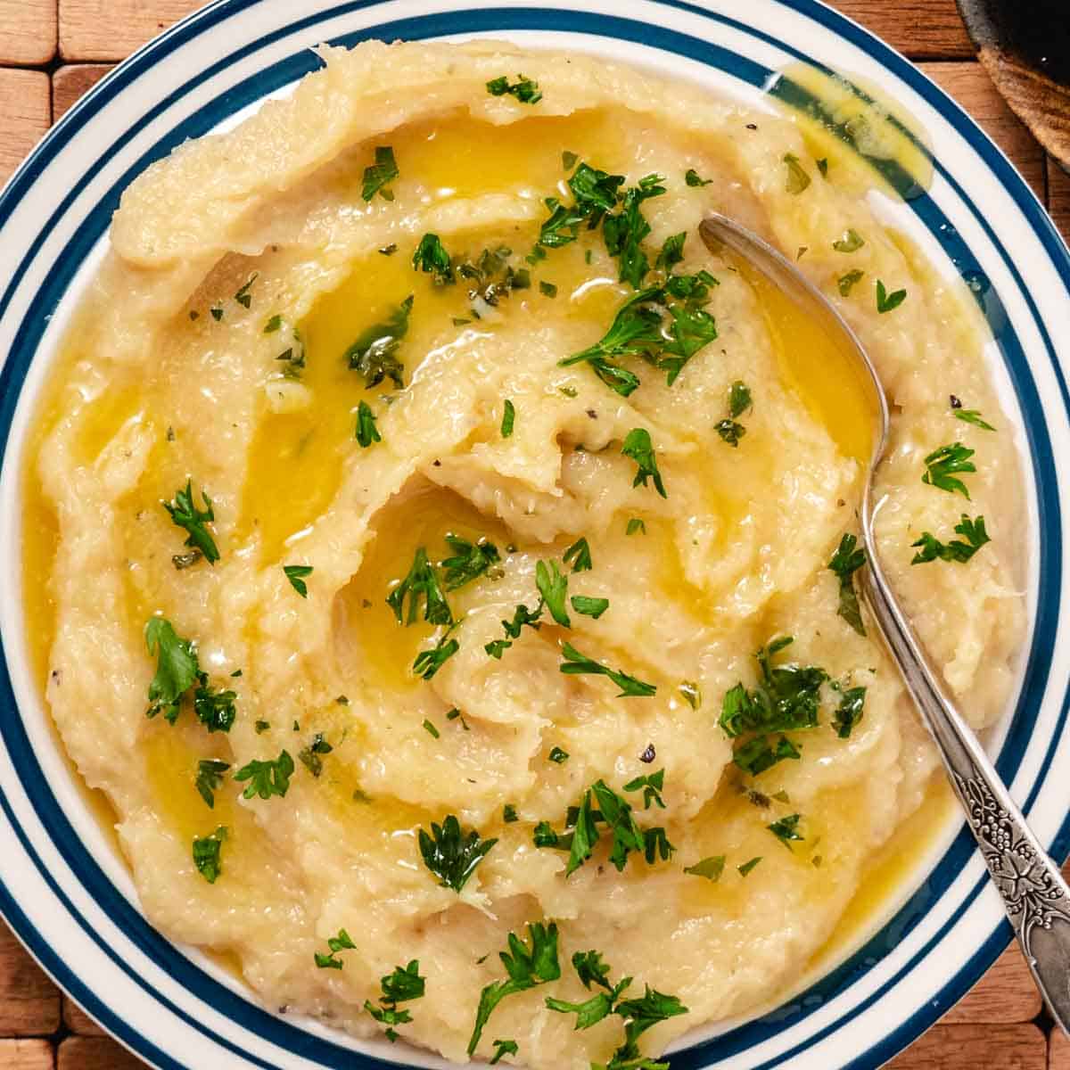 Mashed potato squash roasts until fork-tender, then gets scooped and mashed like potatoes. It's soft, mild, and comforting, without the starch of regular potatoes.