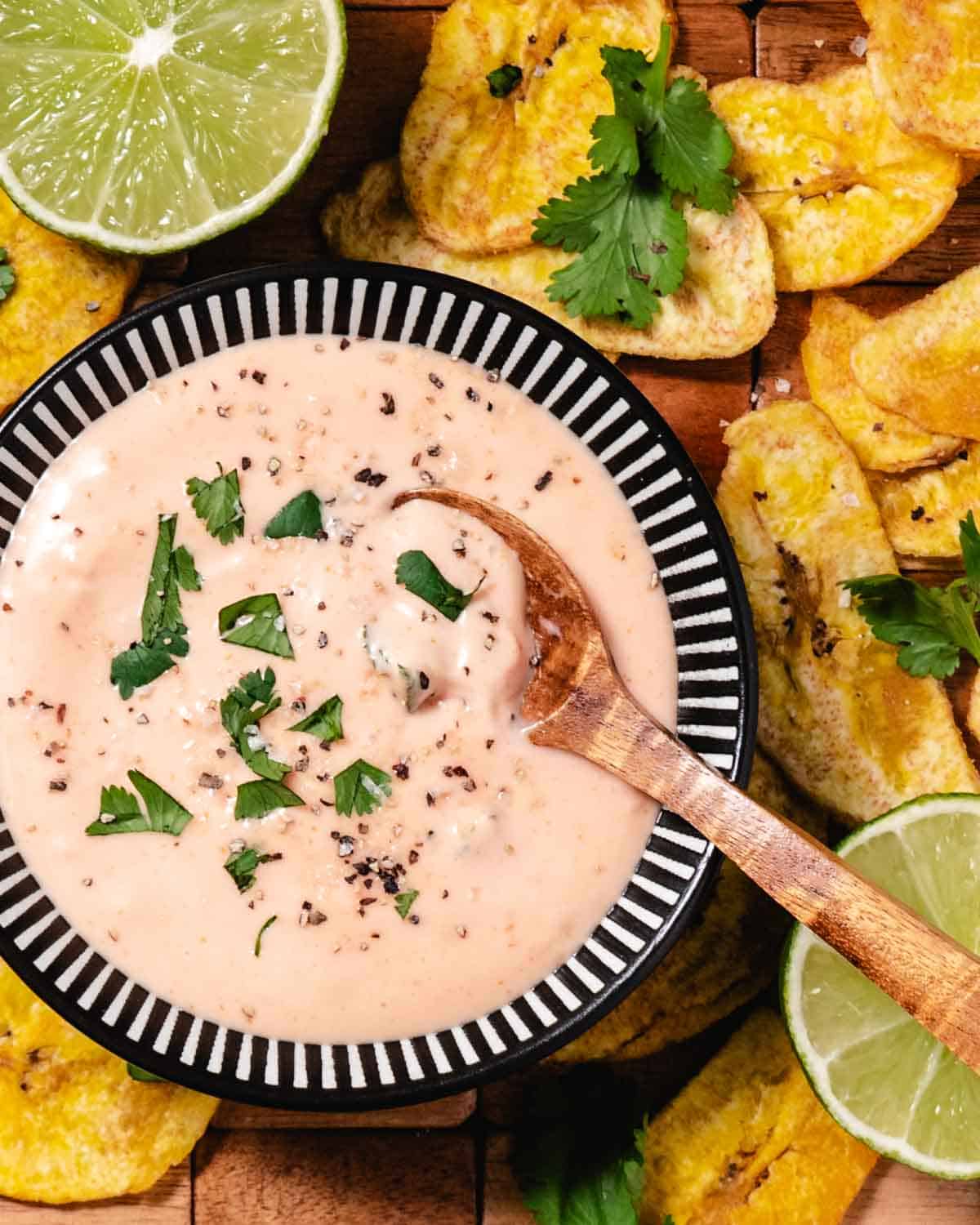 This mayo ketchup sauce is creamy, tangy, and slightly sweet. It's a classic dipping sauce served with tostones, crispy chicken, and other fried foods.