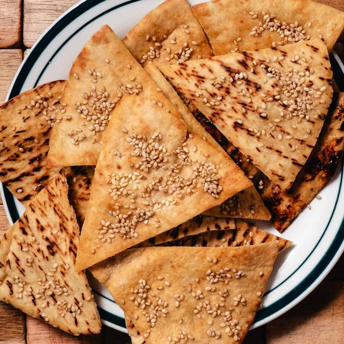 - Lightly brush the rough sides of the pita wedges with the butter mixture. Flip and brush lightly on the other side. Sprinkle with sesame seeds.