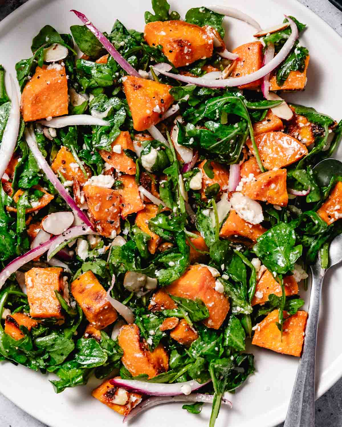 - Add the arugula, red onion, feta, almonds, and cooled roasted sweet potatoes to a large bowl.