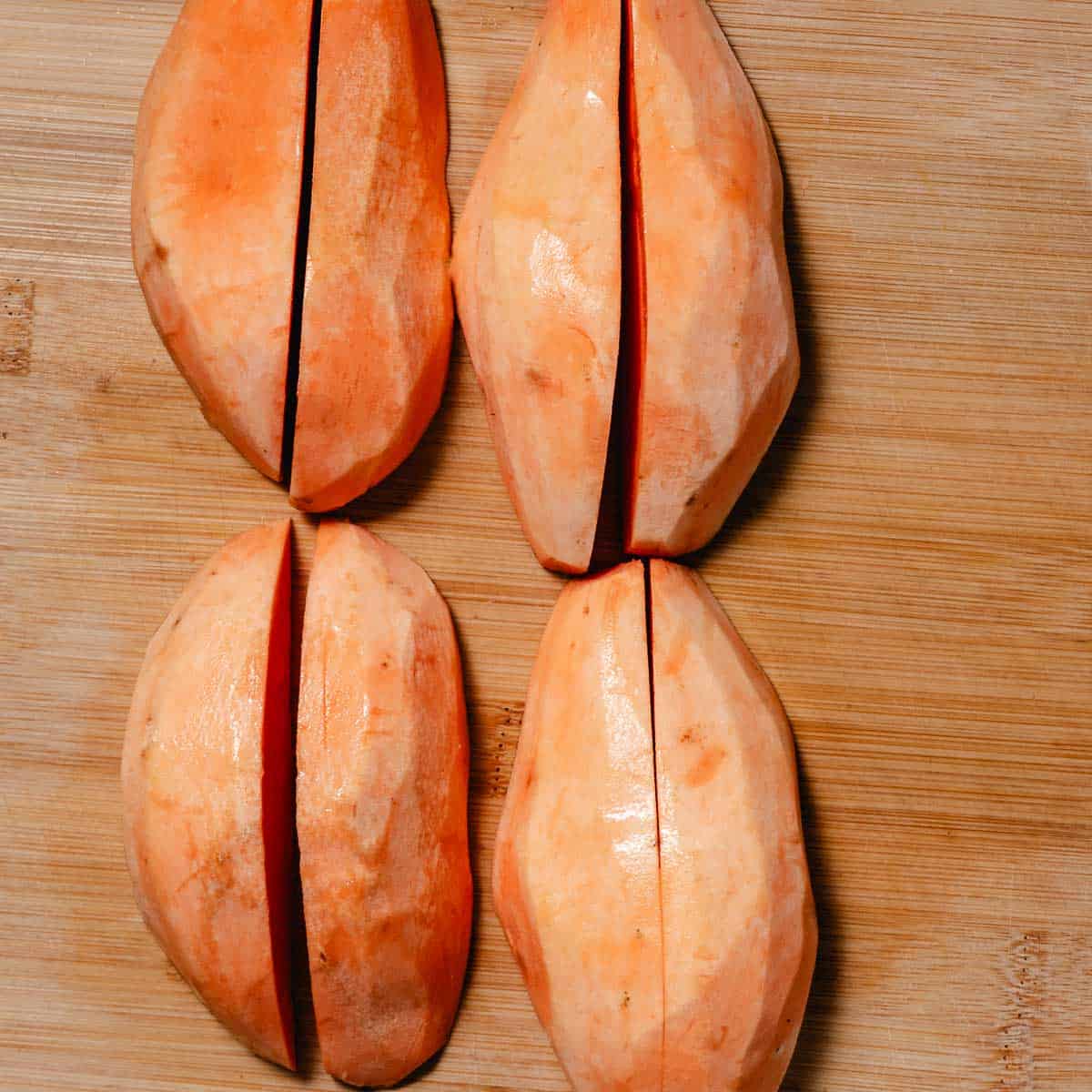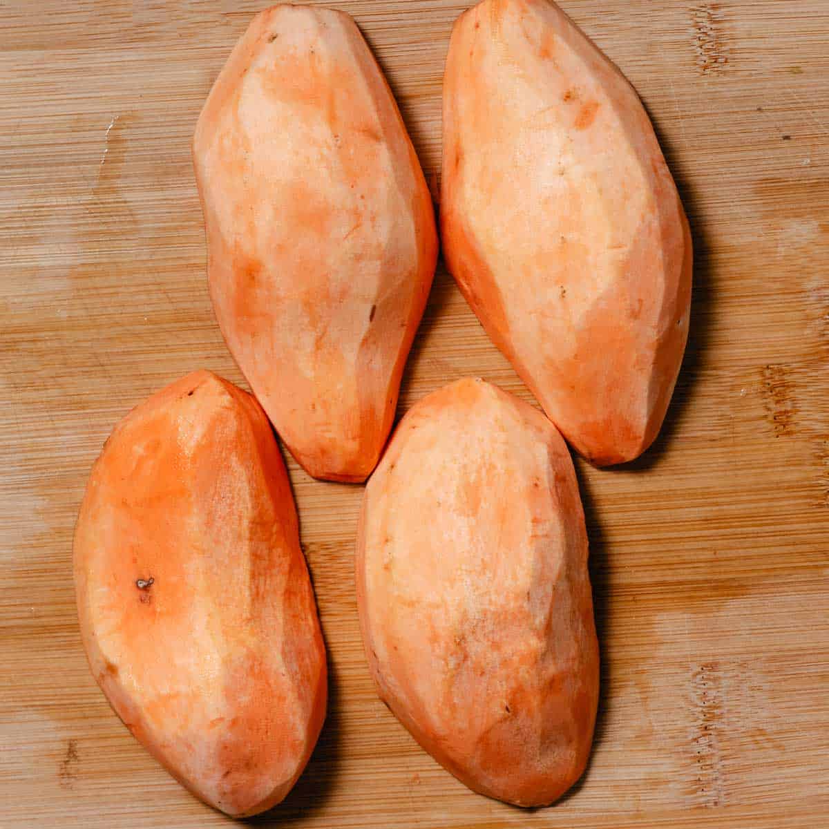 - Peel 1-4 sweet potatoes and cut into chunks.
