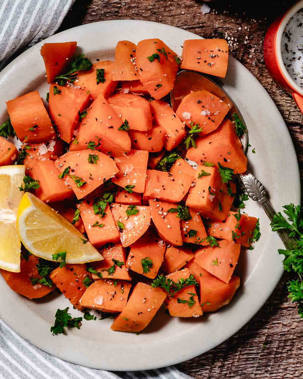 Boiled sweet potatoes go great with steak, chicken, fish, and salads.