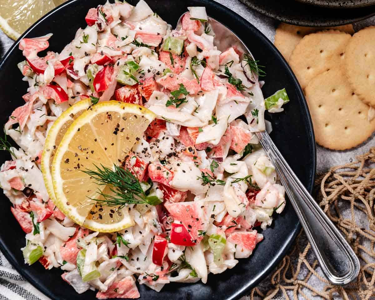 This crab salad recipe blends imitation crab, mayo, and crunchy ingredients including celery, peppers, and red onions. Let it chill for a bit so the flavors settle in and the crab stays firm.