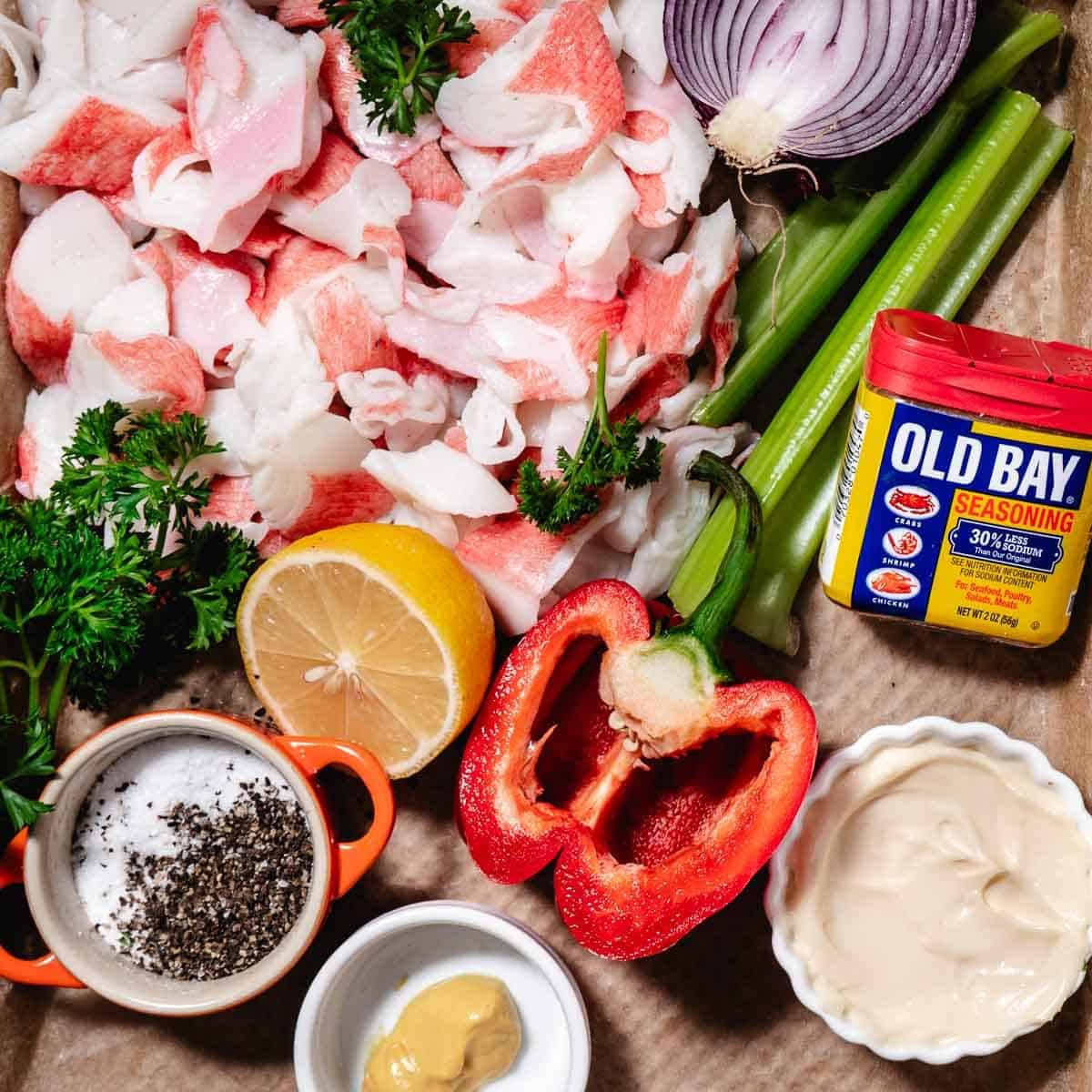 Crab salad is made with imitation crab meat or surimi, mayo, lemon, celery, onions, and seasonings like Old Bay. We add red bell peppers, parsley, and dill for extra color and flavor.