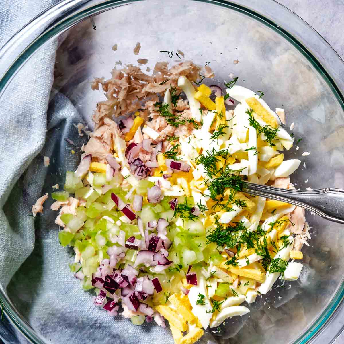 - Add the celery, red onion, dill, and chopped pickle. Toss gently.