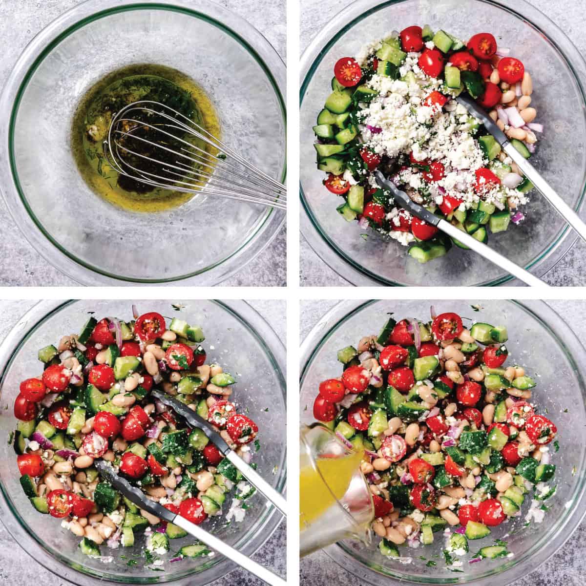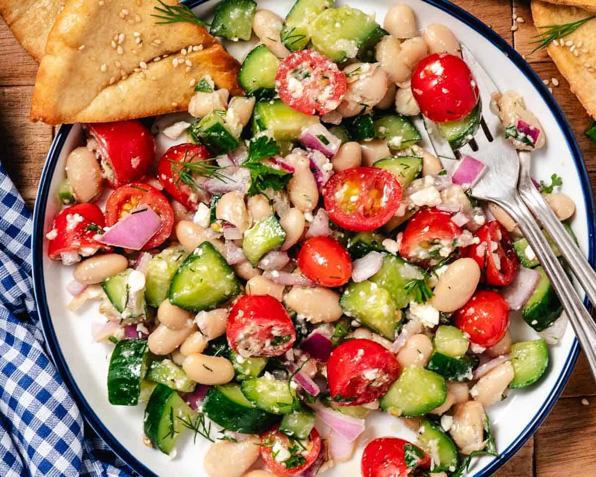 Store leftovers in an airtight container in the refrigerator for up to 3 days. The flavors will blend as it sits, but the cucumbers may soften slightly. If you want to make it ahead, mix the dressing and beans first, then add cucumbers, tomatoes, and feta just before serving.