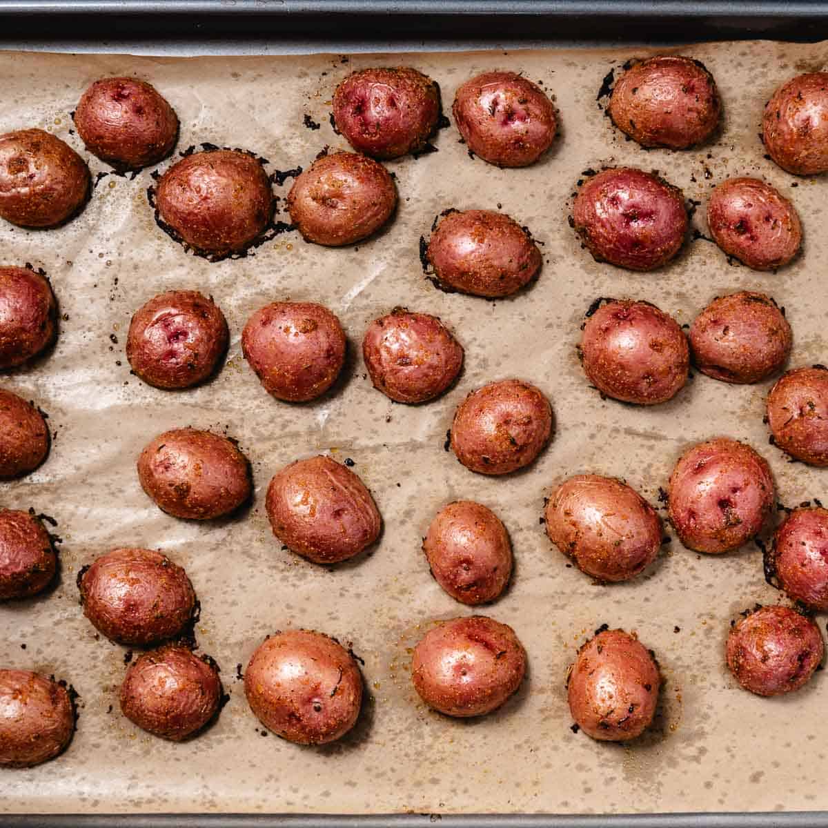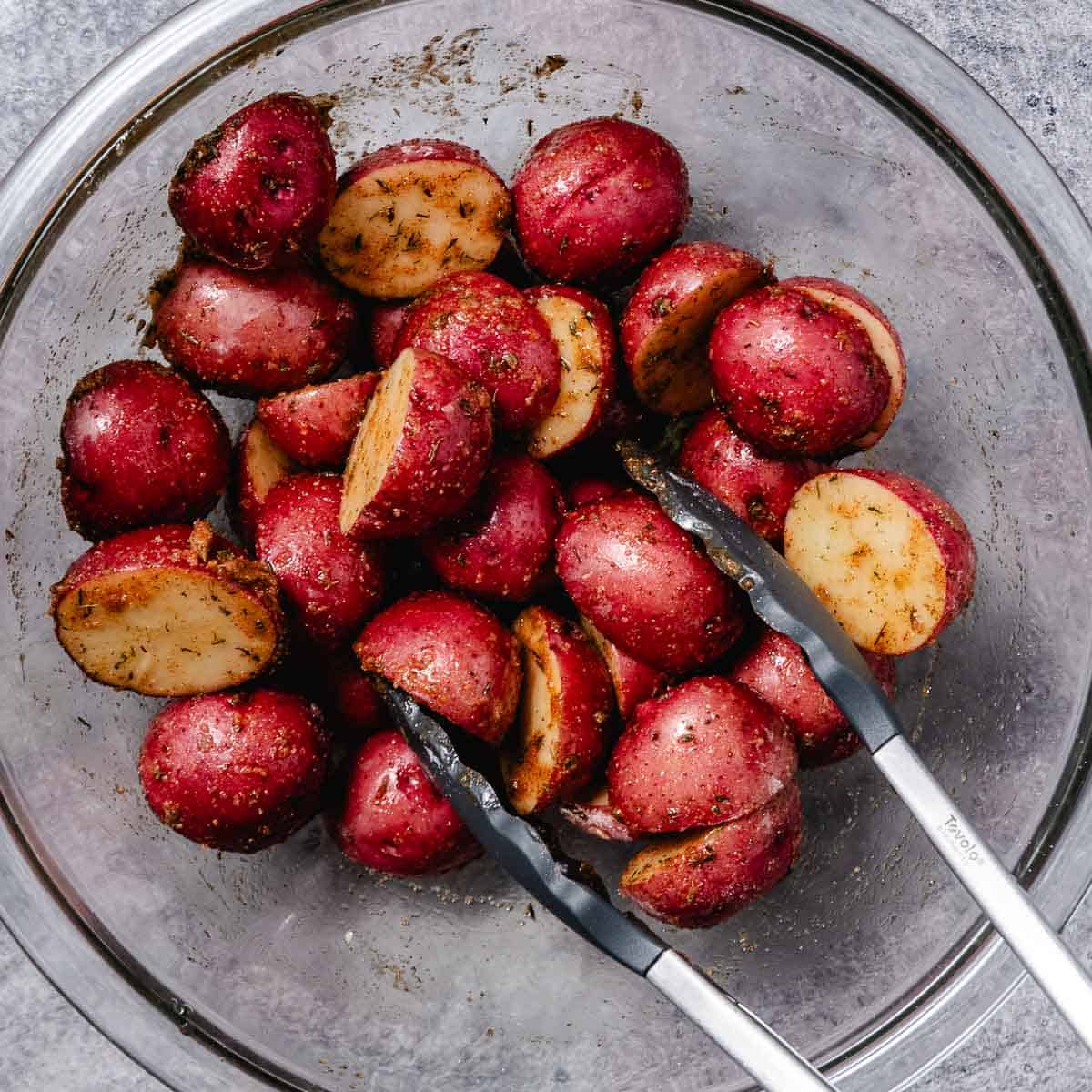 If your red potatoes are closer to the size of a baseball rather than a golf ball, cut them into quarters before seasoning so they cook evenly.