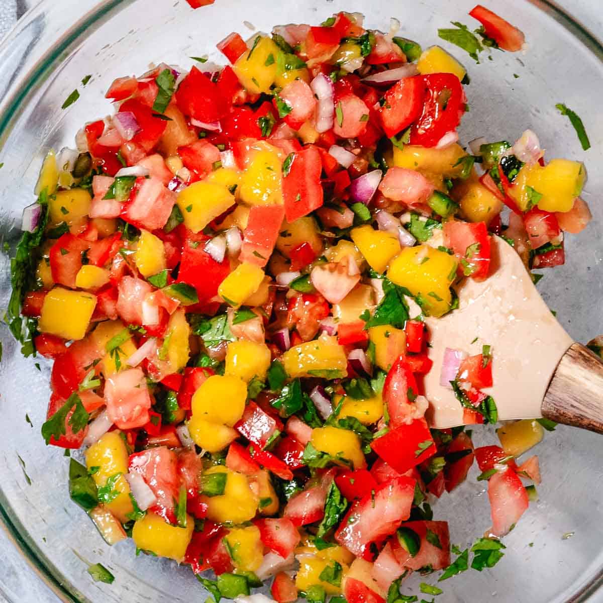 SUBSTITUTE FOR MANGO: In place of mango, try peaches, red plums, pineapple, avocado, or whatever you have that's in season and fresh.STORAGE: The Pico de Gallo can be stored in an airtight container in the refrigerator SerMango salsa, or mango pico de Gallo, can be served with your favorite fish and meat dishes. You can even eat it right out of the bowl.