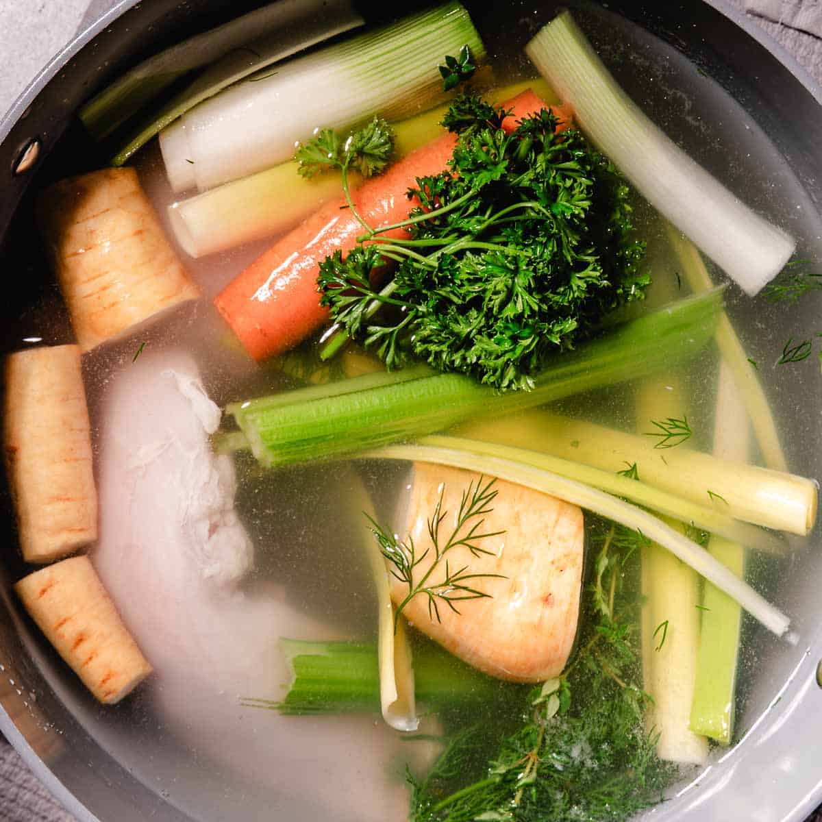 Place chicken, carrots, celery, parsnip, onion, parsley, dill, salt, and pepper in a large pot.